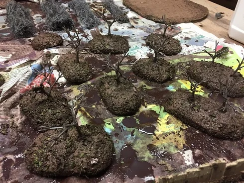 There are three types of tree setup. Above is a set of "blasted trunks" to represent pine trees which have been felled by mortar rounds - visualise devastating scenes from the medic/BotB episode of Band of Brothers.